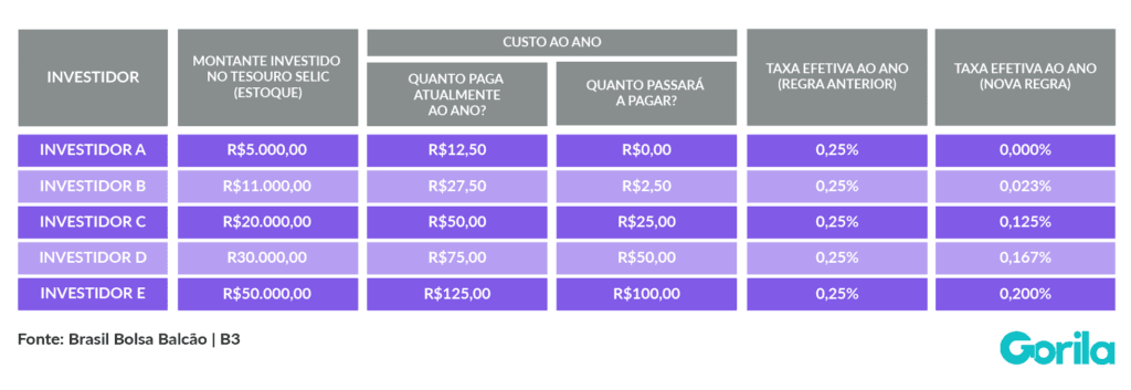 Para entender como foi o efeito da alteração, imagine três investidores: um com R$ 9 mil, outro com R$ 11 mil e um terceiro com R$ 20 mil aplicados em Tesouro Selic.