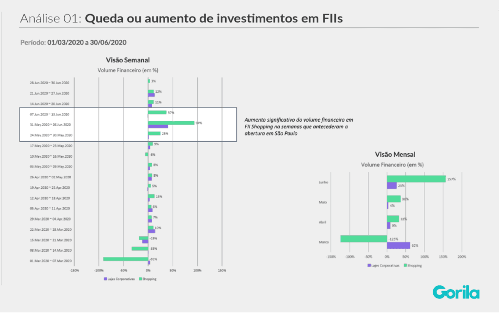 Através do Gorila, percebemos que houve um aumento significativo do volume financeiro em FII de shopping nas semanas que antecederam a abertura em São Paulo, representando 25% entre 24 e 30/5.
